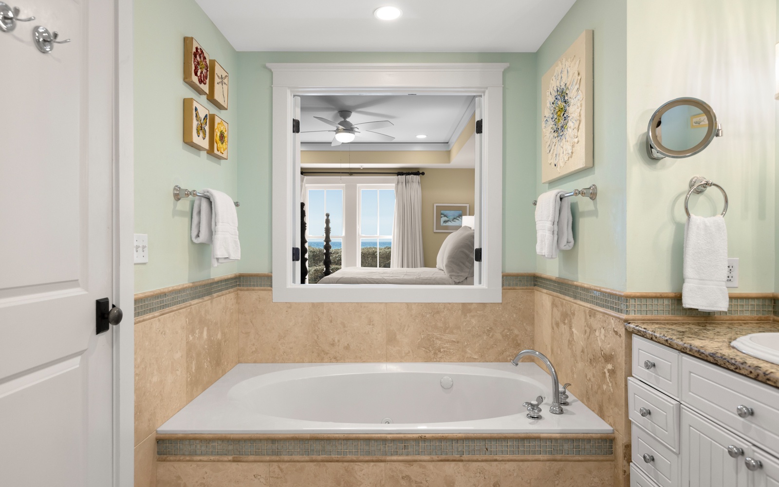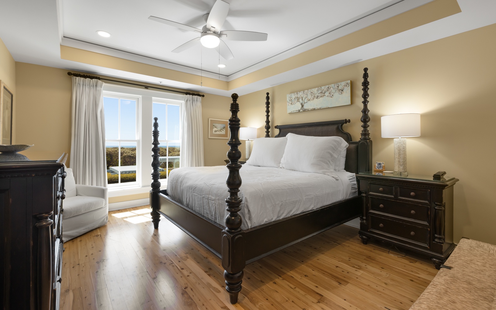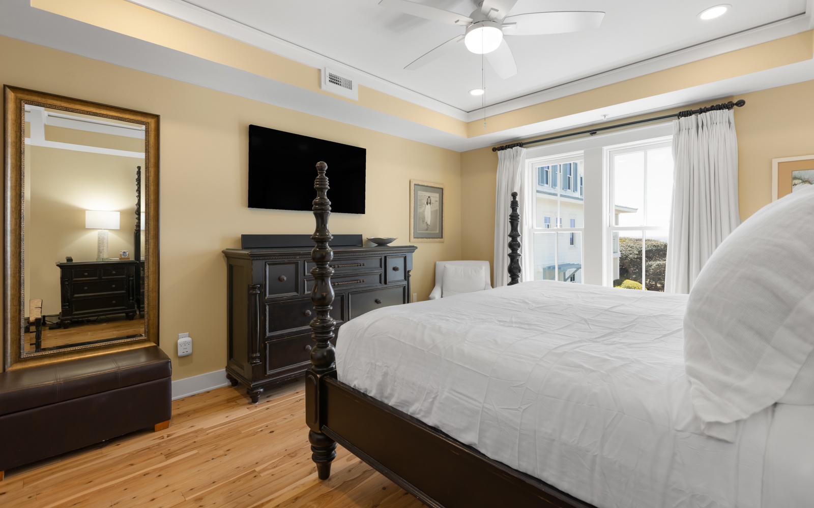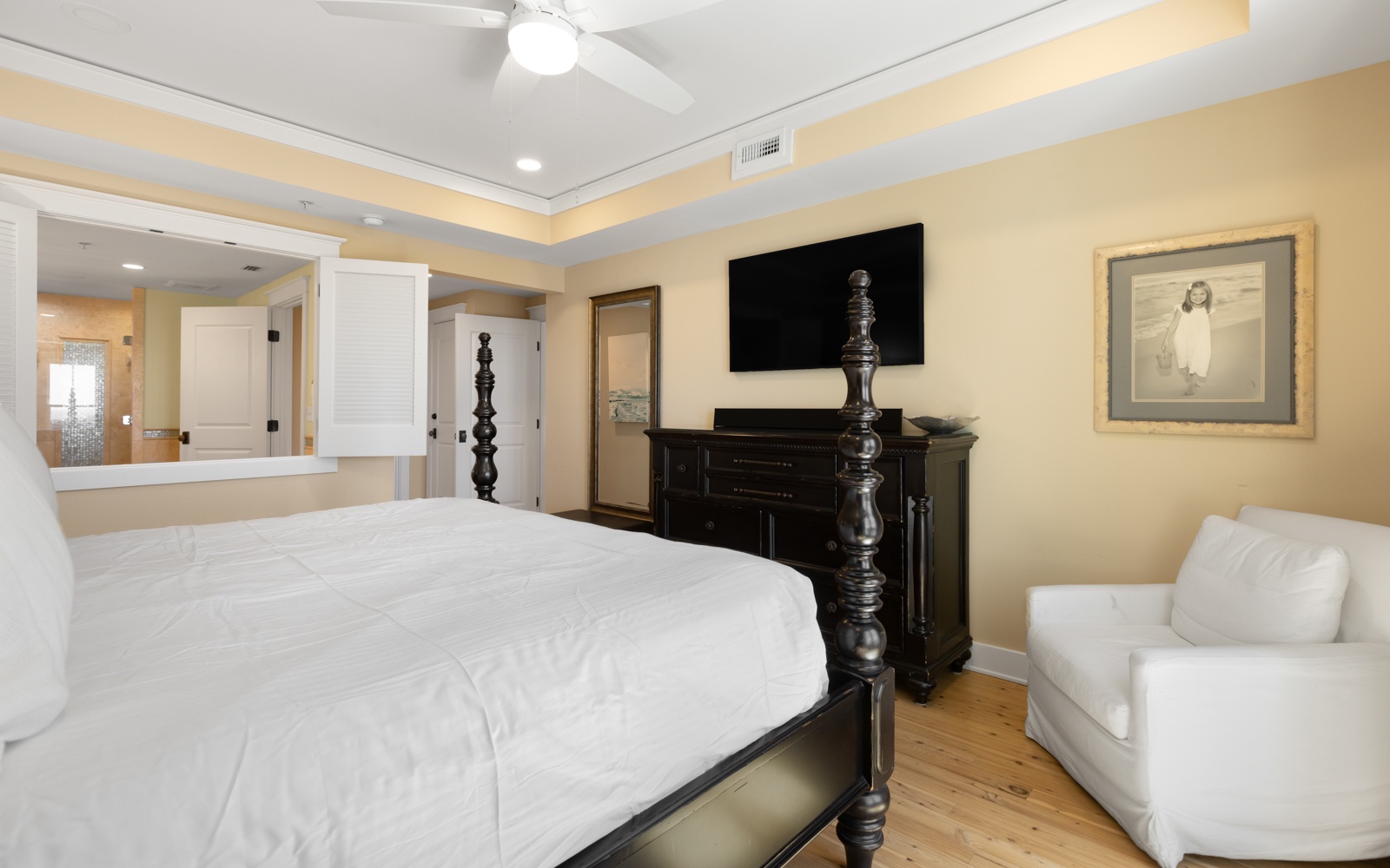 These views can also be seen from the second-floor primary bedroom, with private bathroom and TV.