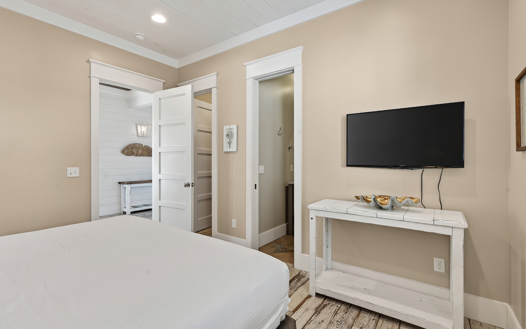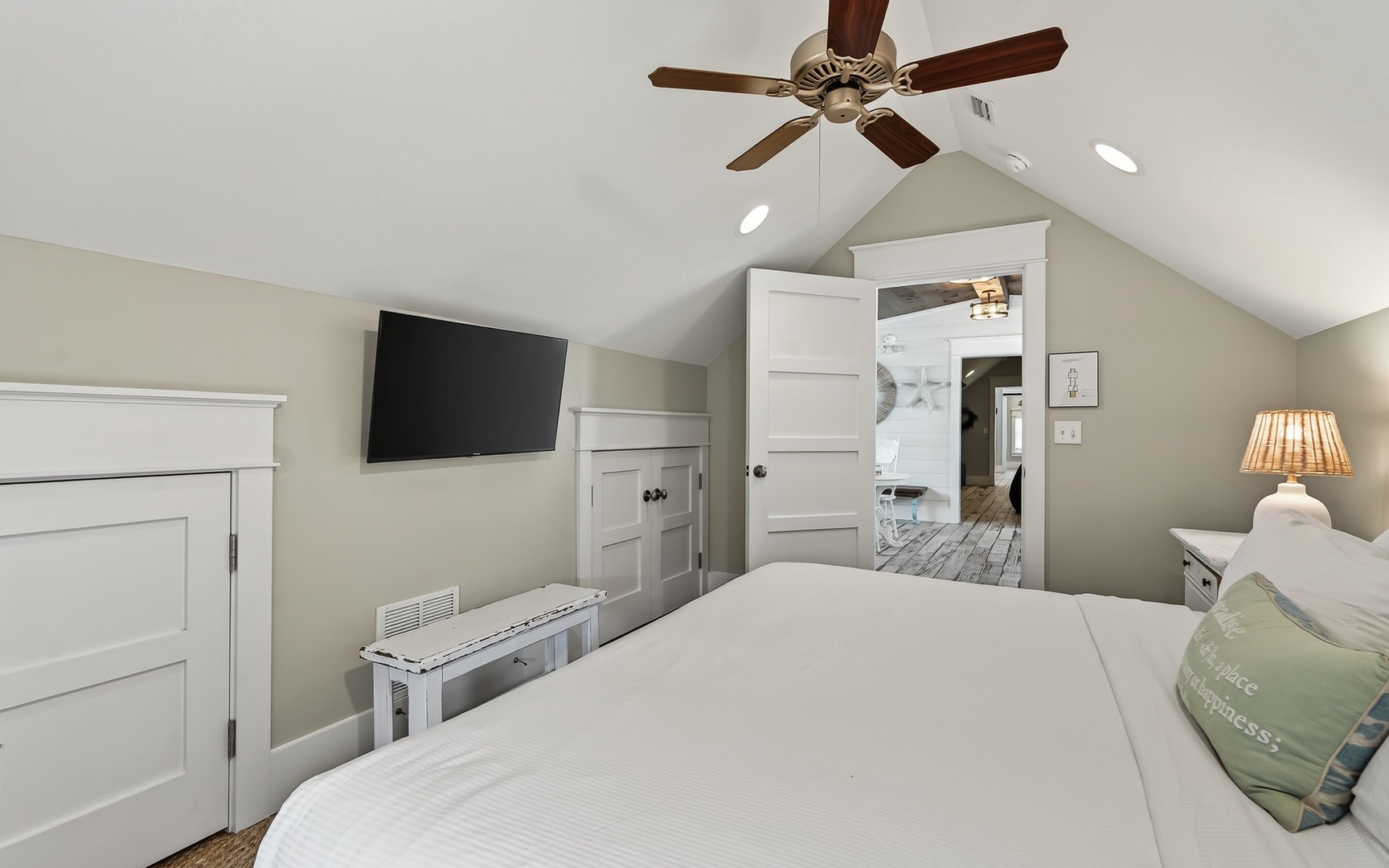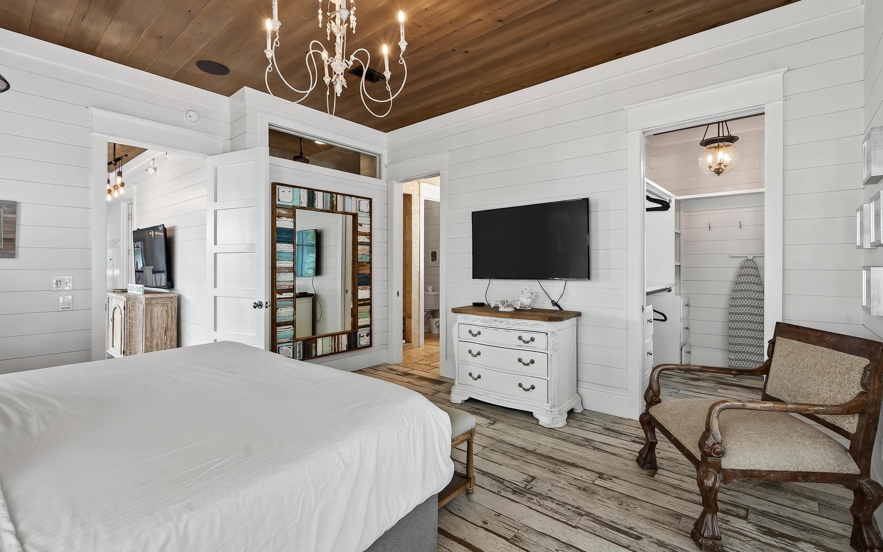 - Primary Bedroom: King bed, TV