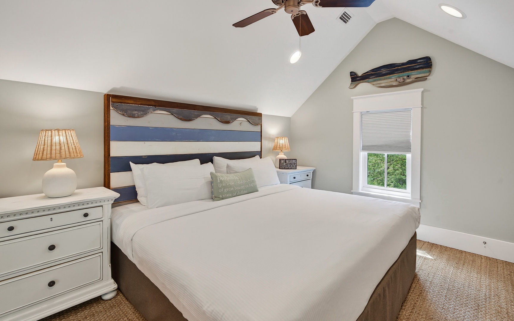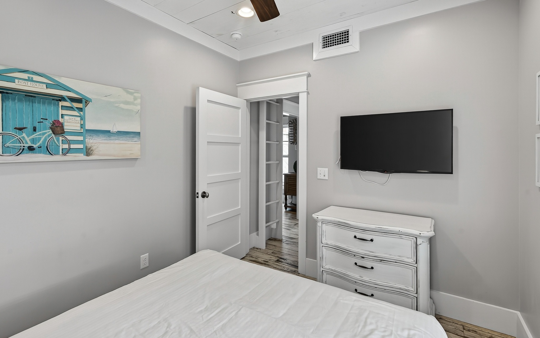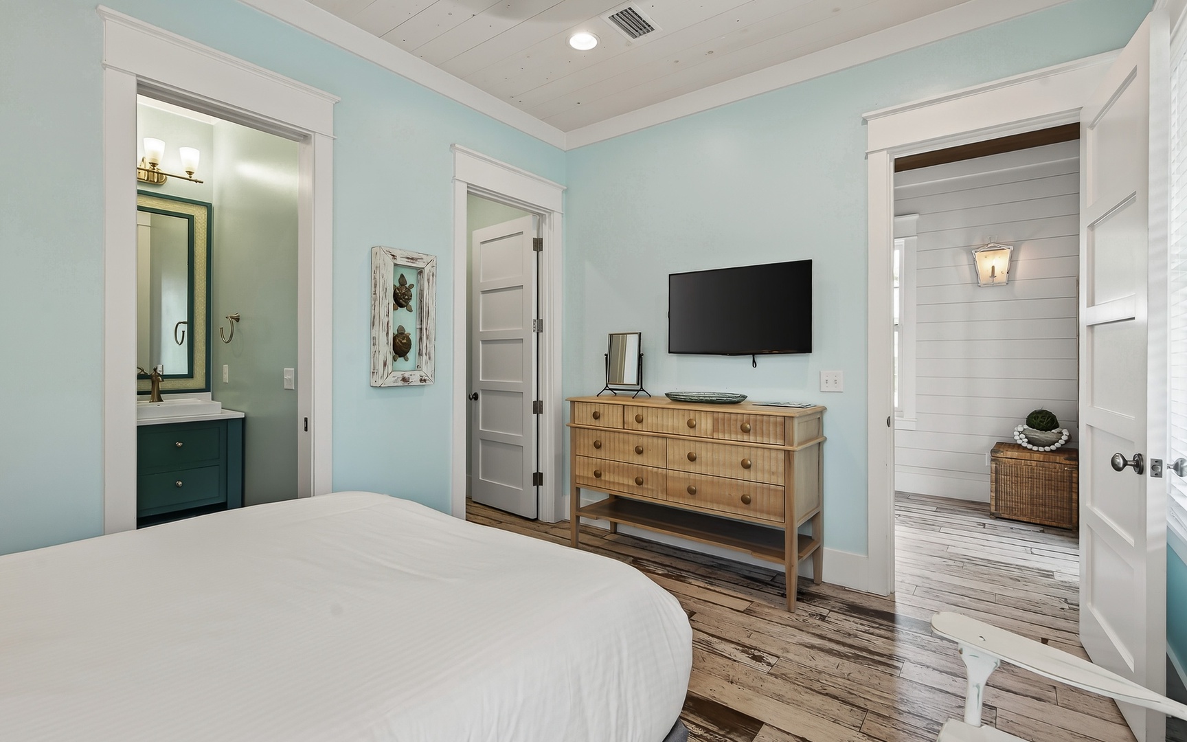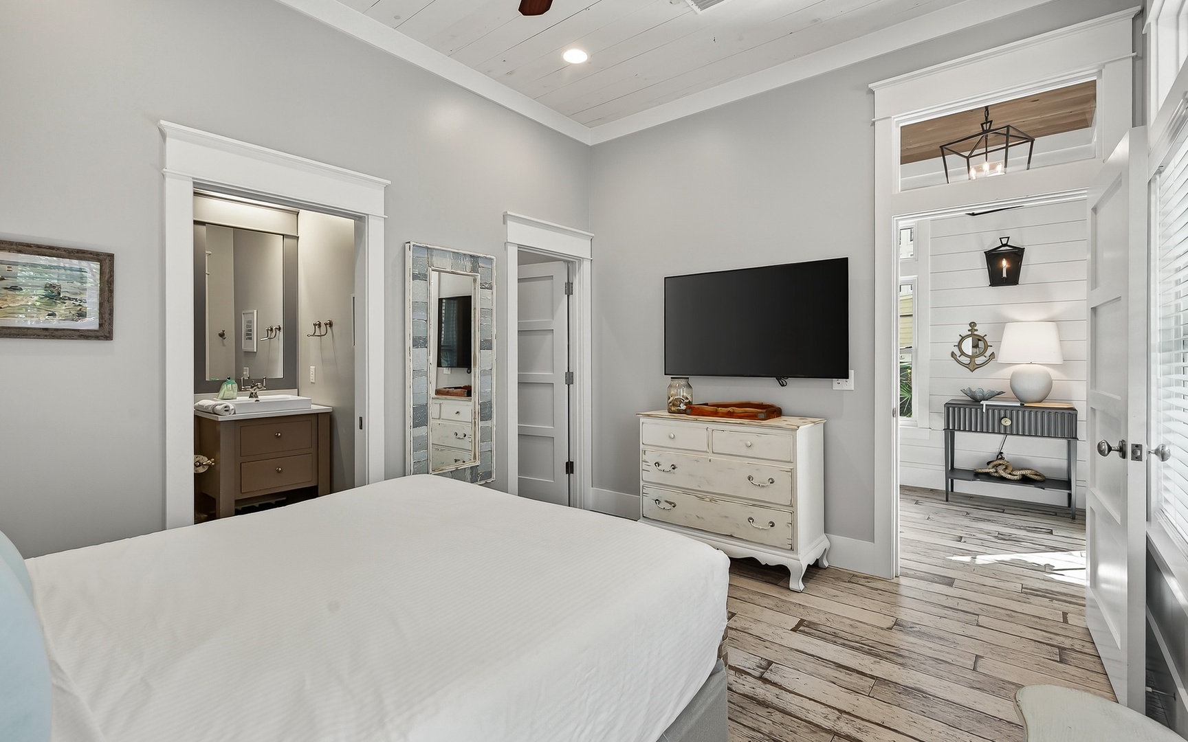 - Primary Bedroom: King bed, TV