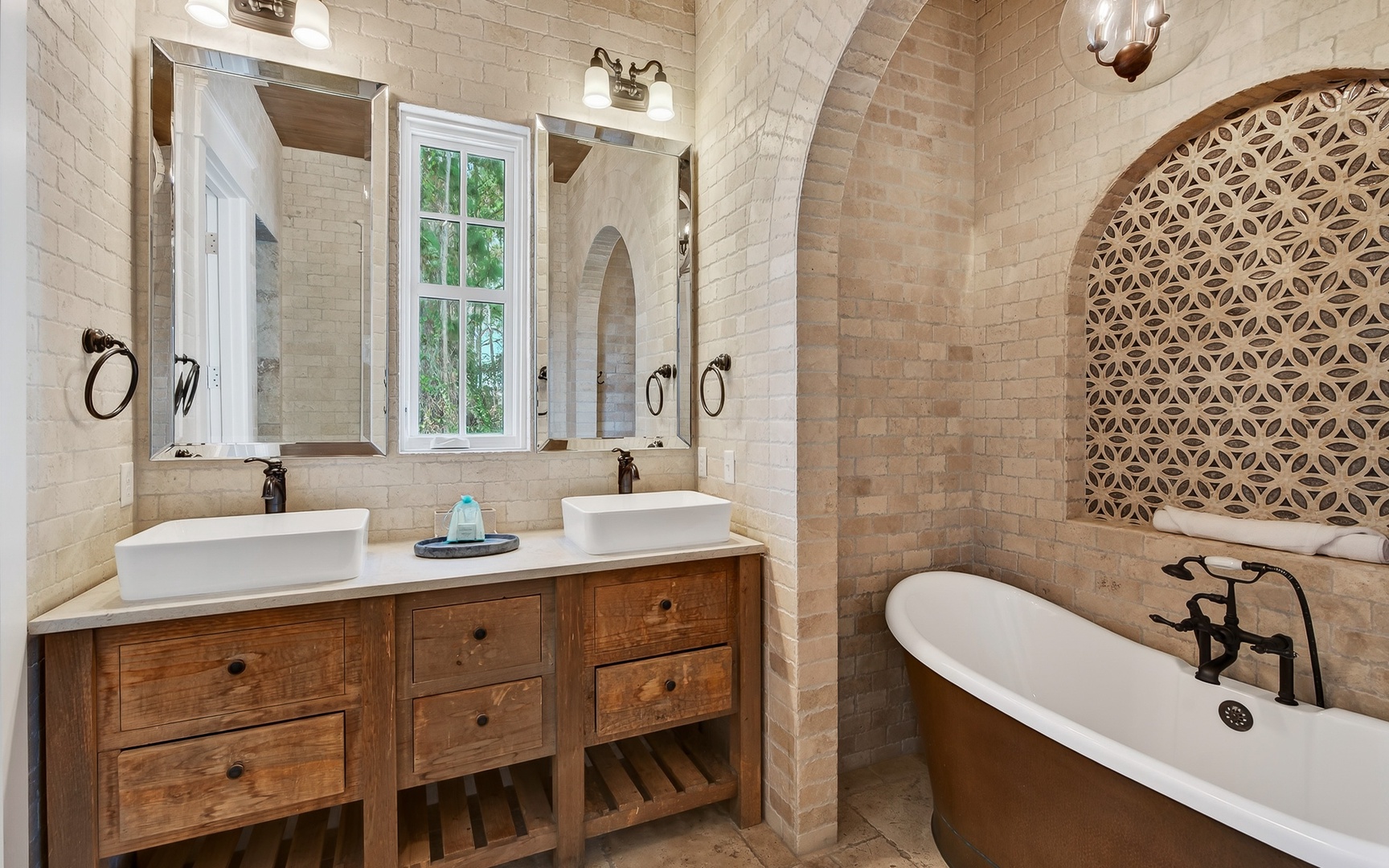 The gorgeous courtyard is the star of the show! The three conjoined fountain pools are simply breathtaking, with benches for lounging, a grill and dining table for cookouts and group meals, and a fireplace for when the night winds down. This ultimate backyard oasis sets the stage for unforgettable memories.