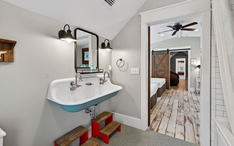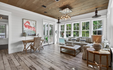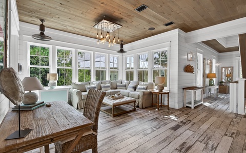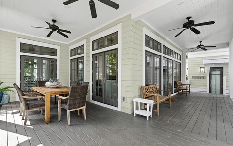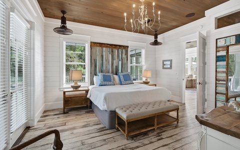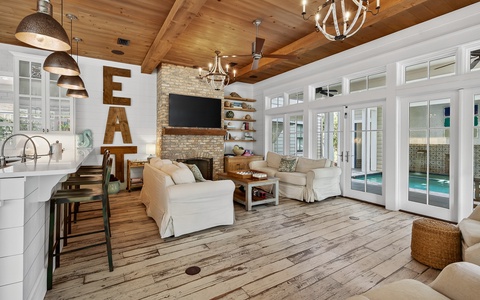 Inside, Watercolor Reunions offers spacious living across three levels with multiple king suites, bunk rooms, and private retreats. The chef’s kitchen features double dishwashers, a movable island, and high-end appliances—perfect for gathering and entertaining. The separate carriage house provides even more privacy, complete with its own sitting area and kitchenette.