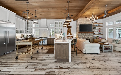 - Kitchen: Movable island, double dishwashers, built-in microwave, double sink, gas stove, large fridge, bar seating