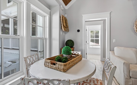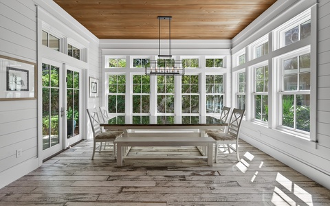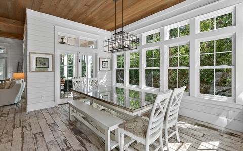- Dining Area: Glass-enclosed nook with large dining table (two benches + chairs)