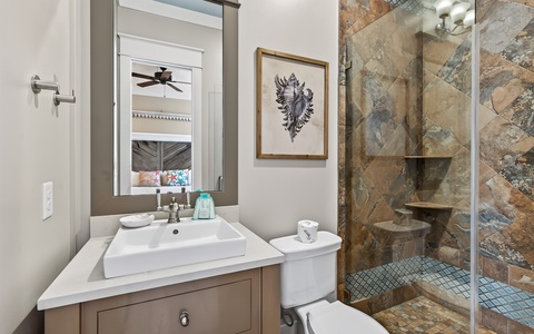 - Queen Bedroom: Queen bed, en suite closet & bathroom (walk-in shower), TV
