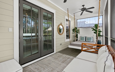 - Queen Bedroom: Queen bed, en suite bathroom (shower/tub), closet, TV, patio access with swing; chairs