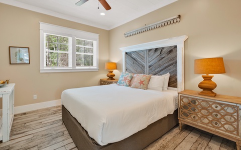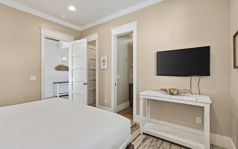 - King Bedroom: King bed, built-in shelving for storage, TV