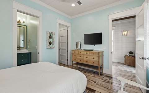 - King Bedroom: King bed, en suite bathroom (walk-in shower), closet, TV
