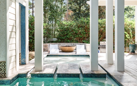 - Outdoor Den: Pool courtyard with fireplace, fountain pools, dining area, benches, outdoor shower