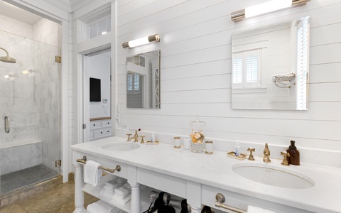 An ideal haven for friends or family seeking tranquility, the upper level has a snug and cozy guest room, king. A second guest room has two twin-over-twin bunk beds, and an additional primary bedroom, king, features an ensuite bath, with a spa-like tub.