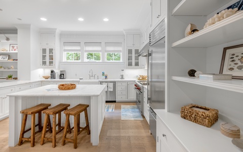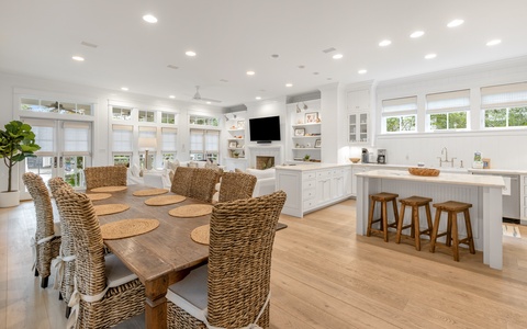 Inside, the bright and inviting first floor includes a grand dining room table, a full kitchen, and a spacious living area. Nearby is a primary bedroom, king, with an en-suite bathroom.